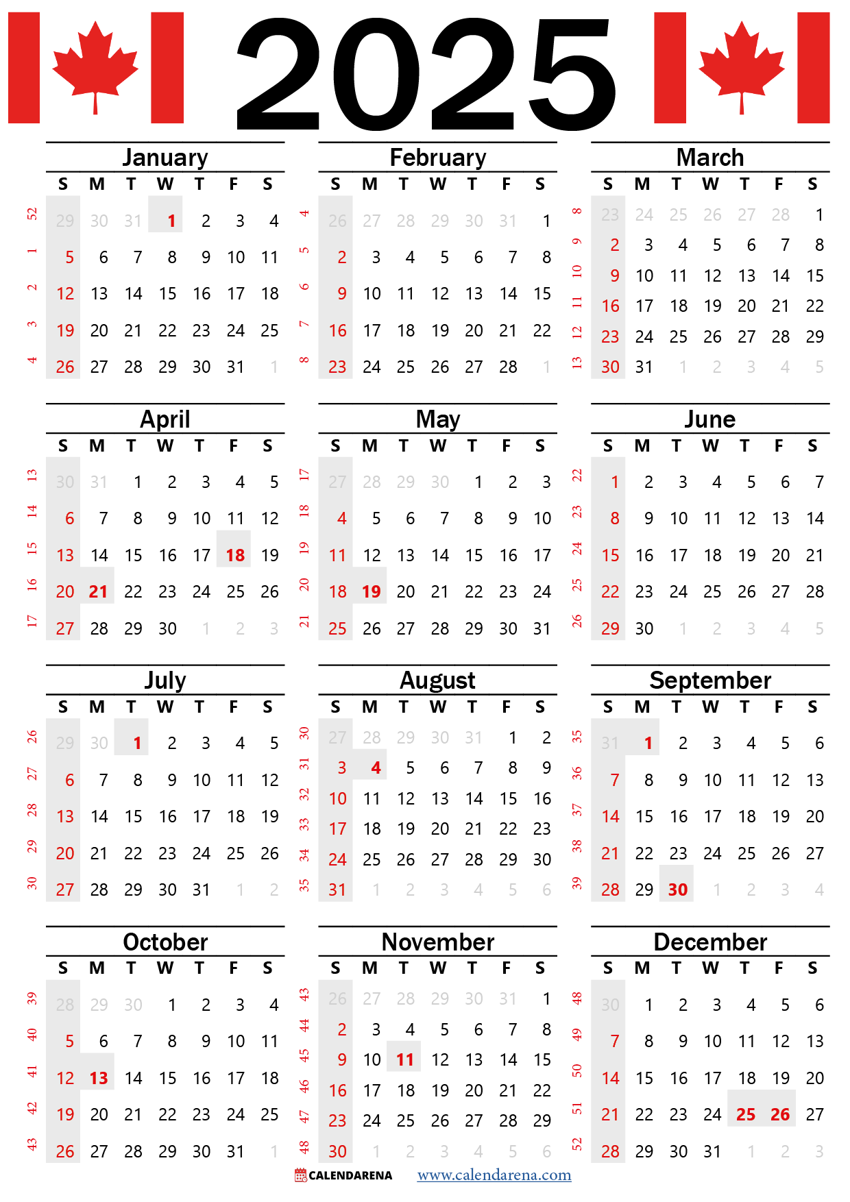 Download and Print 2025 Calendar Canada With Week Numbers Listed below