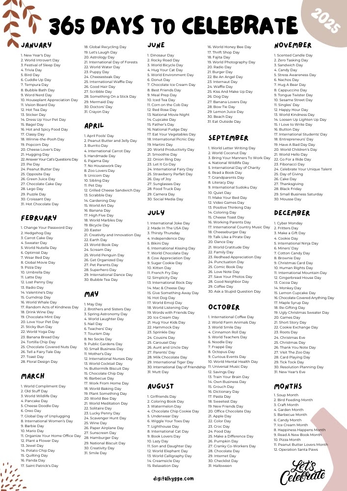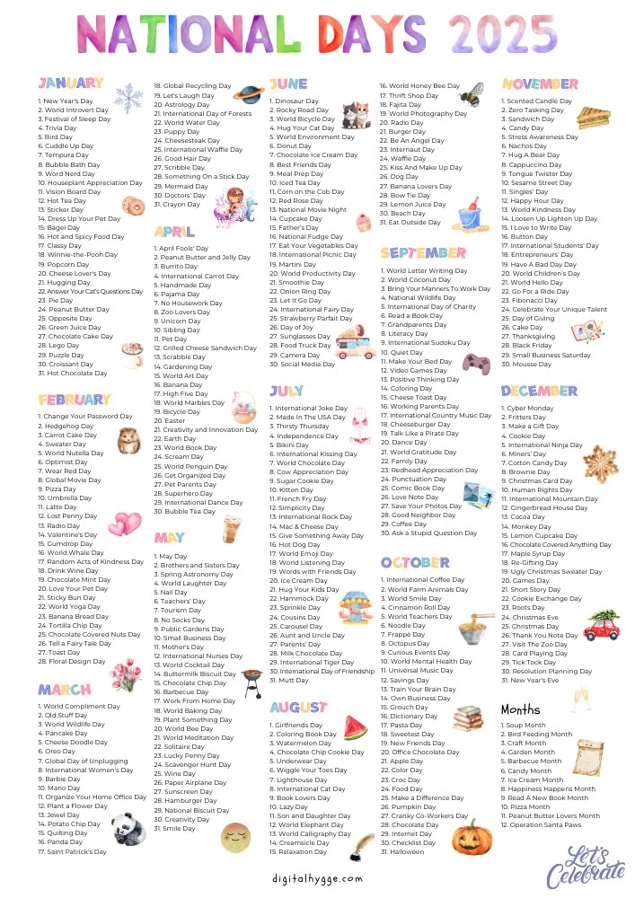 As you fill out your 2025 calendar with national days, you’ll have something to look forward to each month. These special days can break up the routine and add some extra happiness and enjoyment to your year.