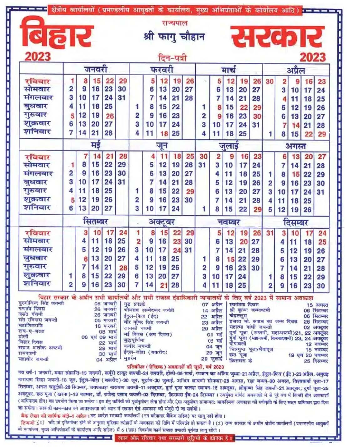 Bihar Sarkar Calendar 2025 Shiksha Vibhag