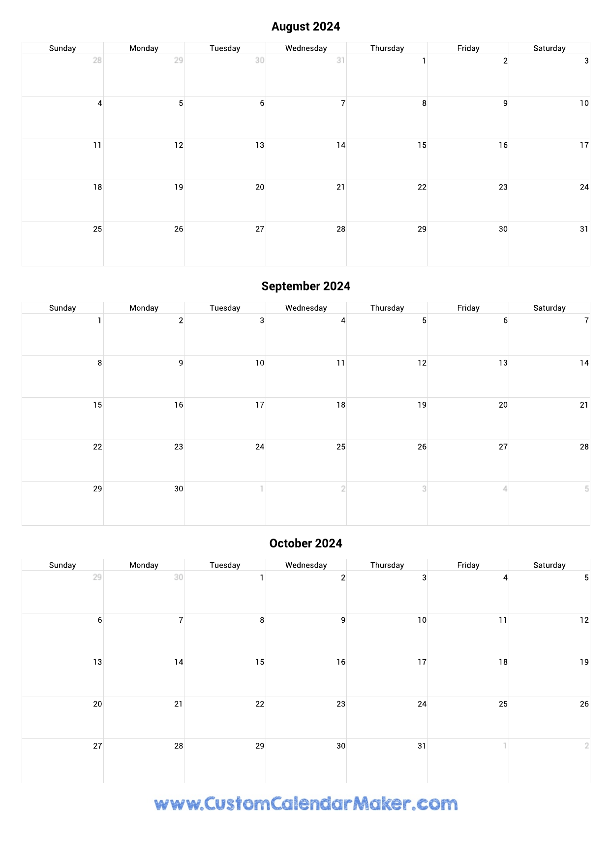 Don’t wait until the last minute to get organized! Download our blank calendars for August, September, and October today and start planning your months with ease. Stay on top of your schedule and never miss an important date again with our handy printable templates.