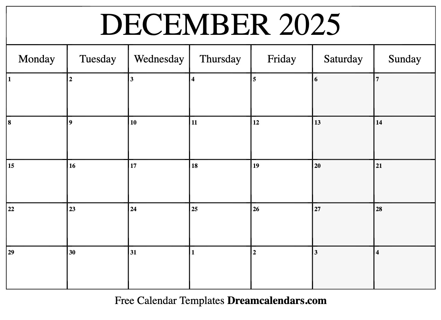 Download and Print Blank Calendar Template December 2025 Printable Listed below