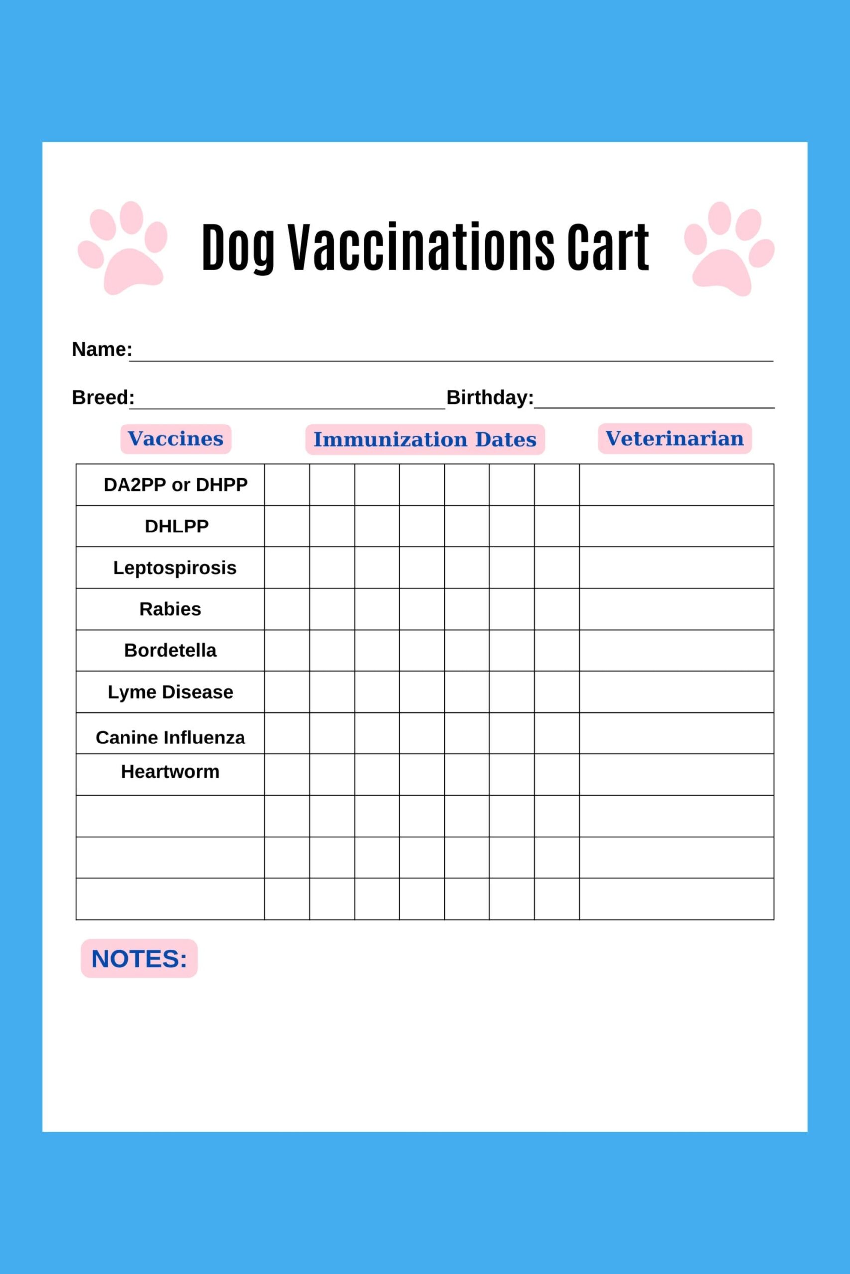 Keeping track of your dog’s vaccinations is crucial to ensure they stay healthy and up-to-date on their shots. With our free printable form, you can easily document each vaccination your dog receives, including the date, type of vaccine, and the veterinarian who administered it.