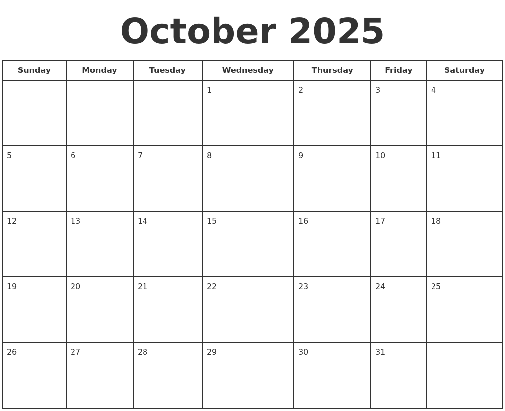 Take control of your schedule and never miss an important date again with our blank October 2025 calendar. Download it for free, print it out, and start planning your month with ease. Stay organized and on top of your game with our printable calendar today!