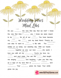 The Bridal Shower Vow Game Mad Libs Free Printable is a creative twist on the traditional wedding vows. Guests can fill in the blanks with funny or heartfelt words to create a unique and memorable vow for the bride and groom. It’s a great icebreaker and keepsake for the happy couple!
