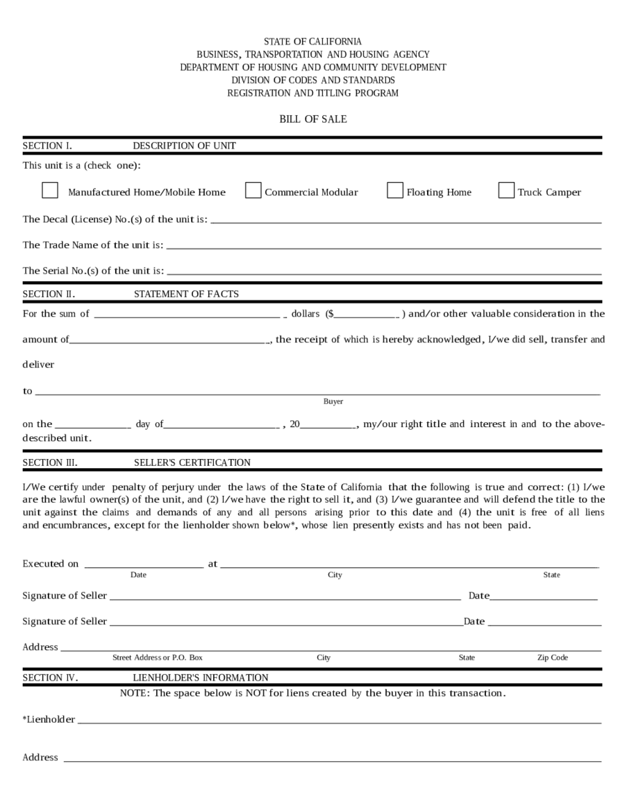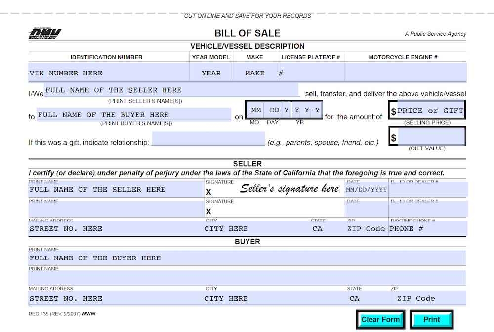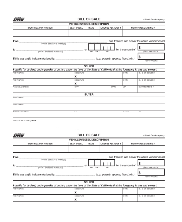 Ca DMV Bill Of Sale Printable Form