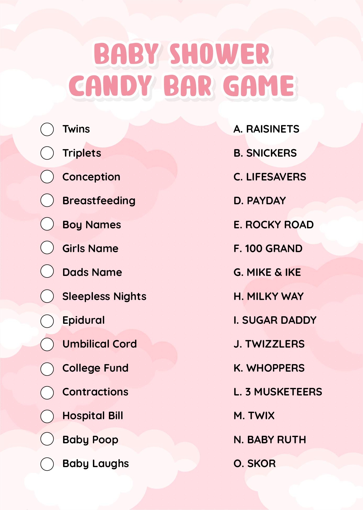 The Candy Bar Baby Shower Game involves matching baby-related phrases or questions with the names of popular candy bars. It’s a simple yet entertaining game that will keep your guests engaged and entertained throughout the shower. Plus, it’s easy to set up and requires minimal preparation.