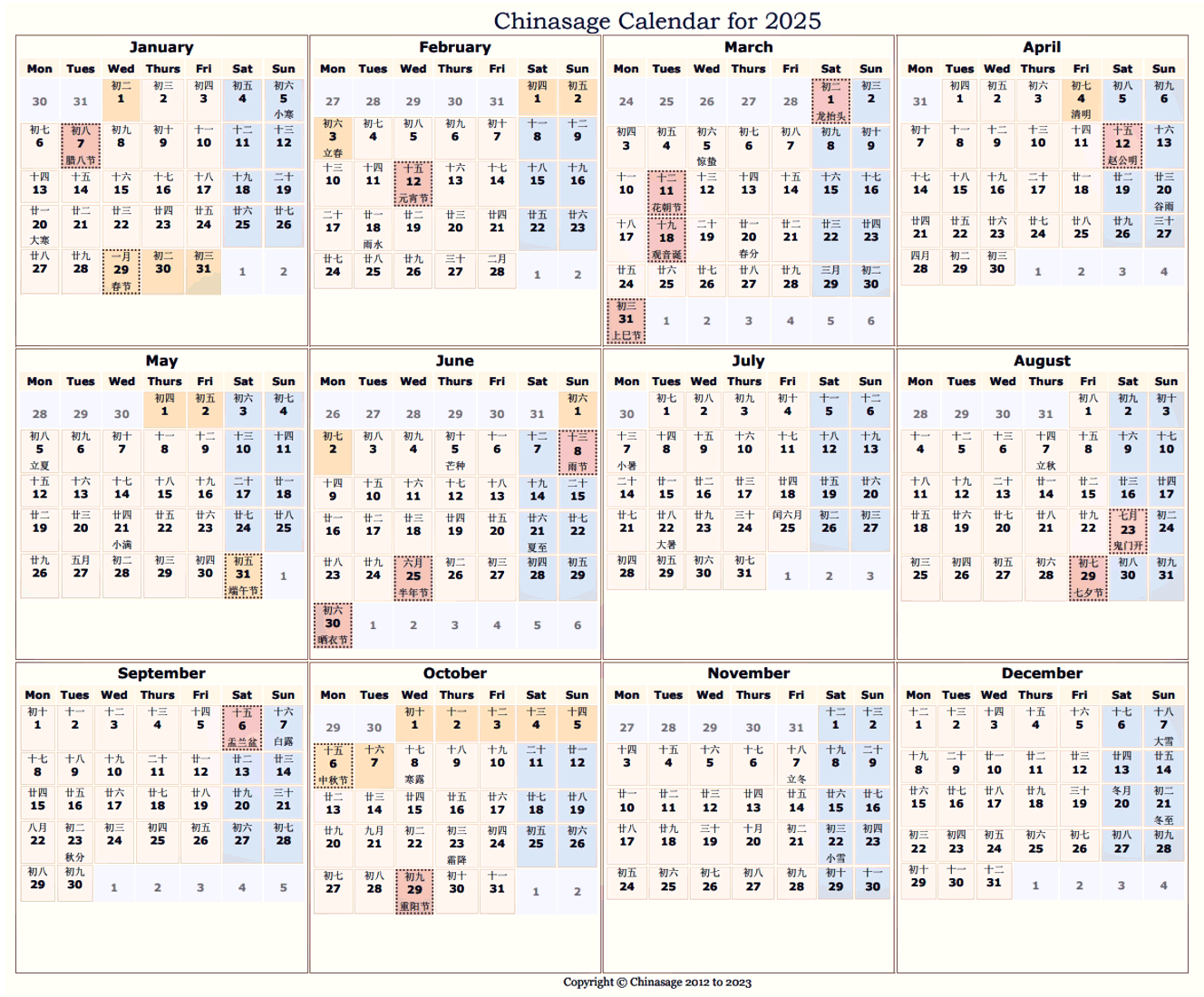 Download and Print Chinese Calendar 2025 English Listed below