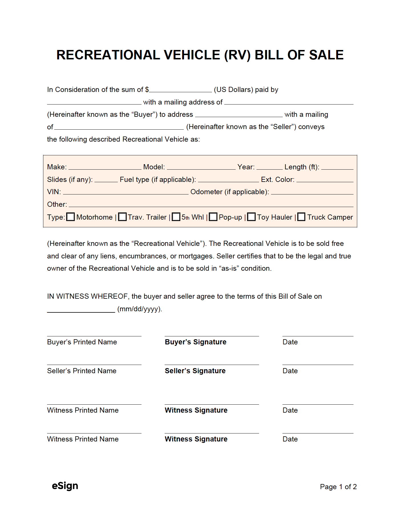 Download and Print Printable Blank Bill Of Sale For Motorhome Listed below