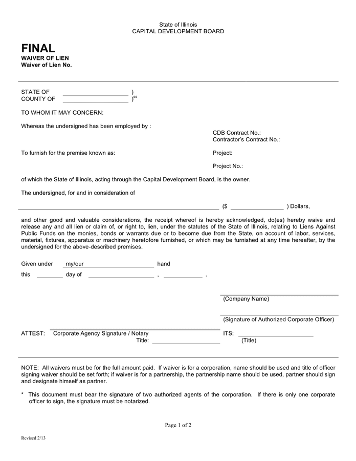 Download and Print Printable Blank Illinois Contractor Lien Waiver Listed below
