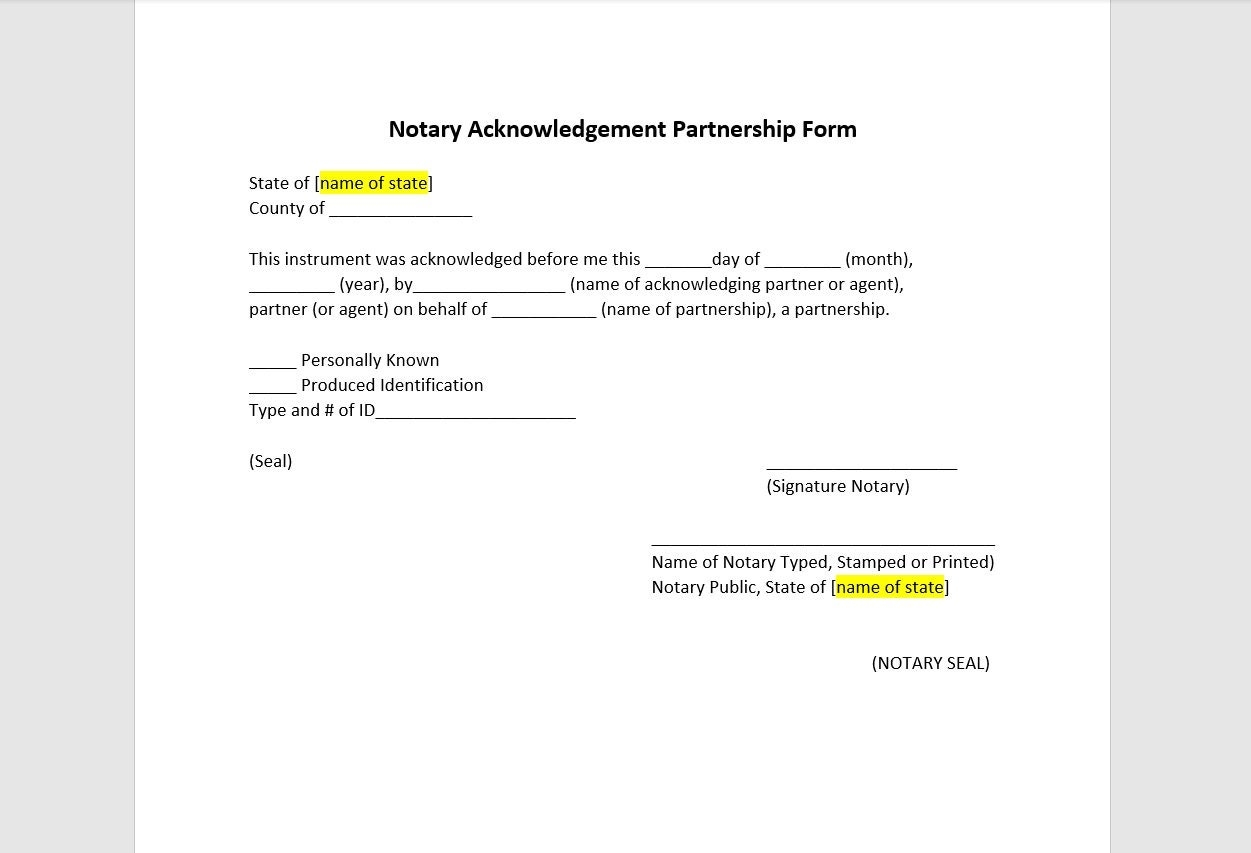 Download and Print Printable Blank Notary Form For Business Partnership Listed below