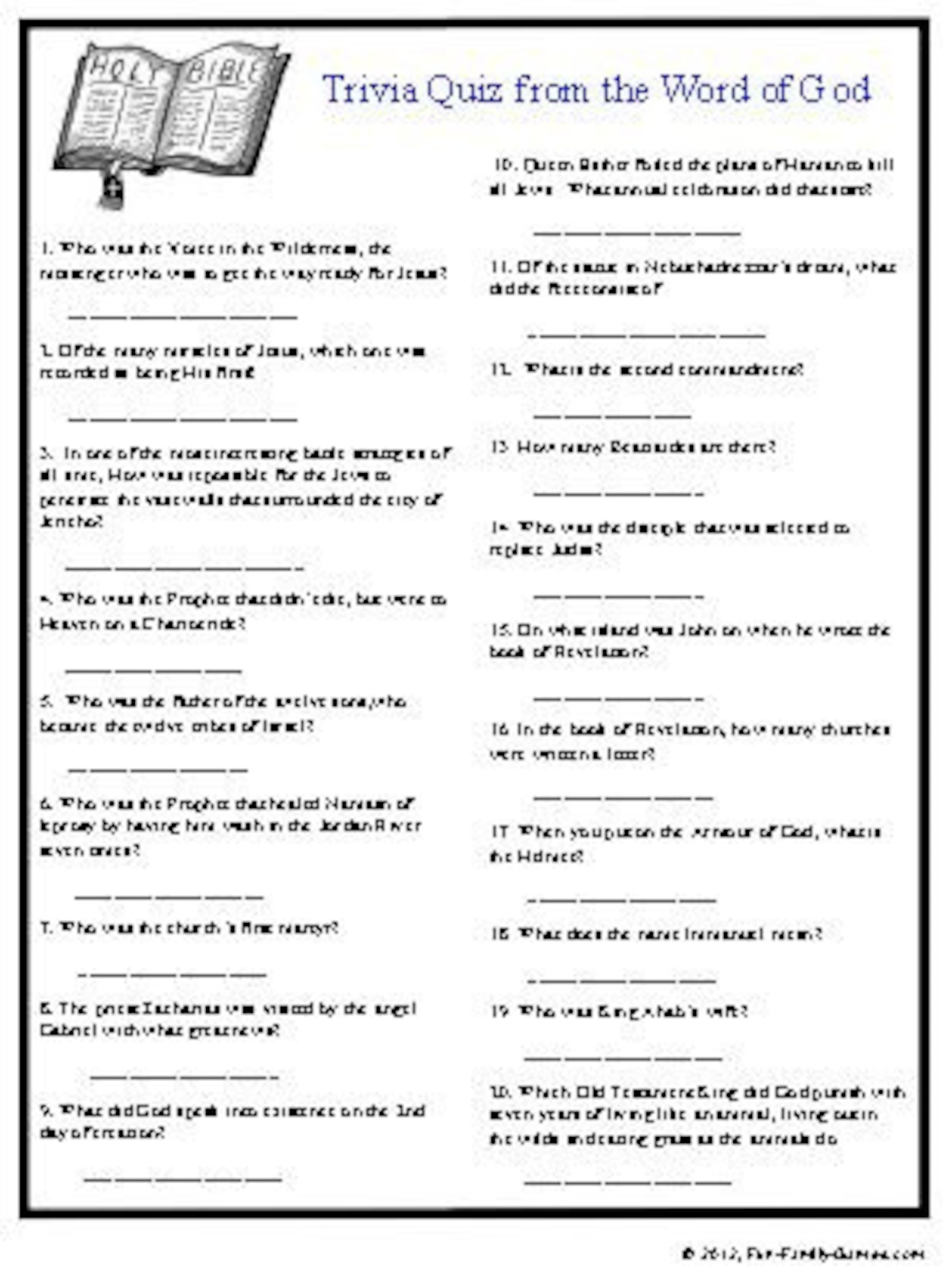 Are you looking for a fun and engaging way to test your knowledge of the Bible? Look no further than printable fill in the blank Bible trivia! These interactive quizzes are a great way to challenge yourself and learn more about the stories and teachings found in the Bible.