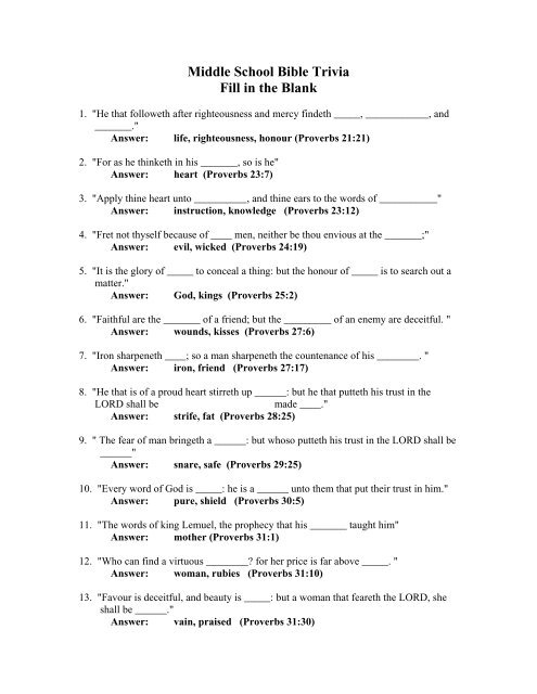 Whether you are studying the Bible on your own or with a group, printable fill in the blank Bible trivia can be a valuable tool for deepening your understanding of the scriptures. You can use them as a study guide, a game at a Bible study group, or simply as a fun way to pass the time.