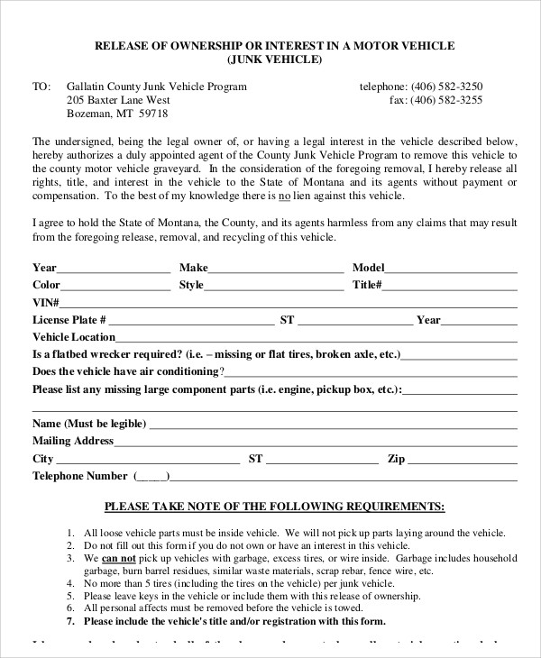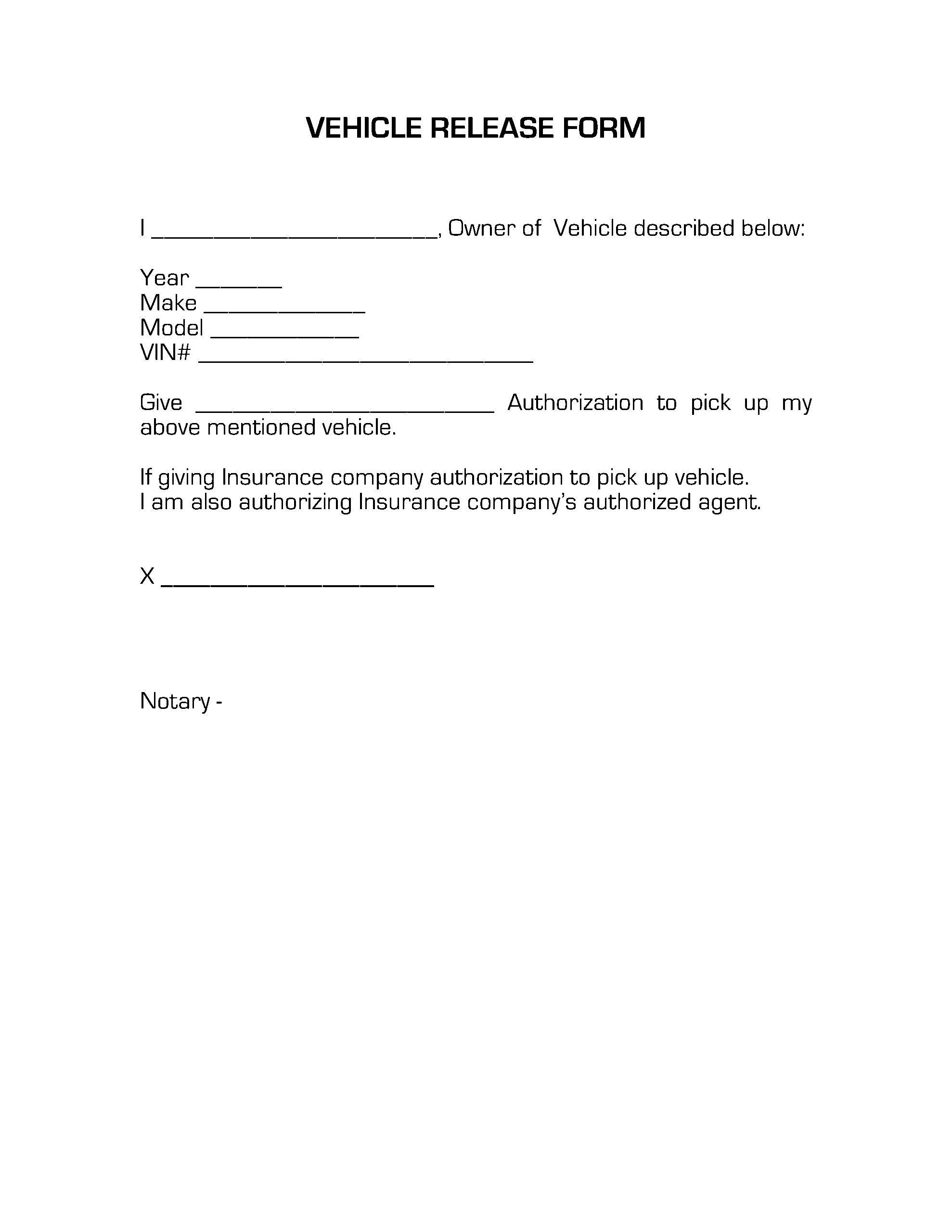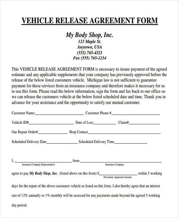 Download and Print Printable Vehicle Release Form Template Listed below