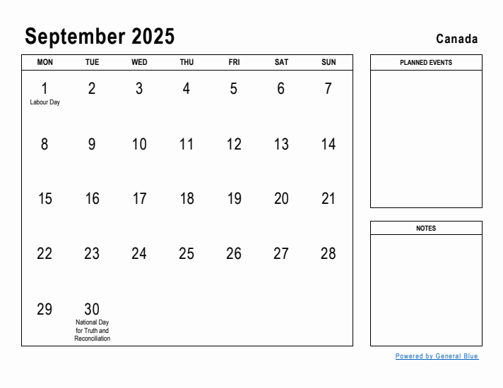 Download and Print September 2025 Calendar Canada Listed below